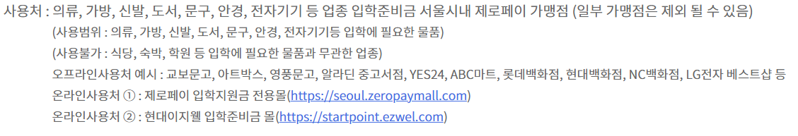 | 온라인 사용처 | 제로페이 전용몰, 현대이지웰 입학준비금 몰 |