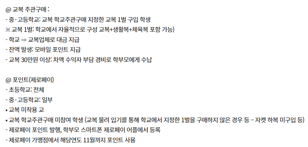 | 지원금 | 초등 20만 원 / 중·고 30만 원 (제로페이 포인트) |