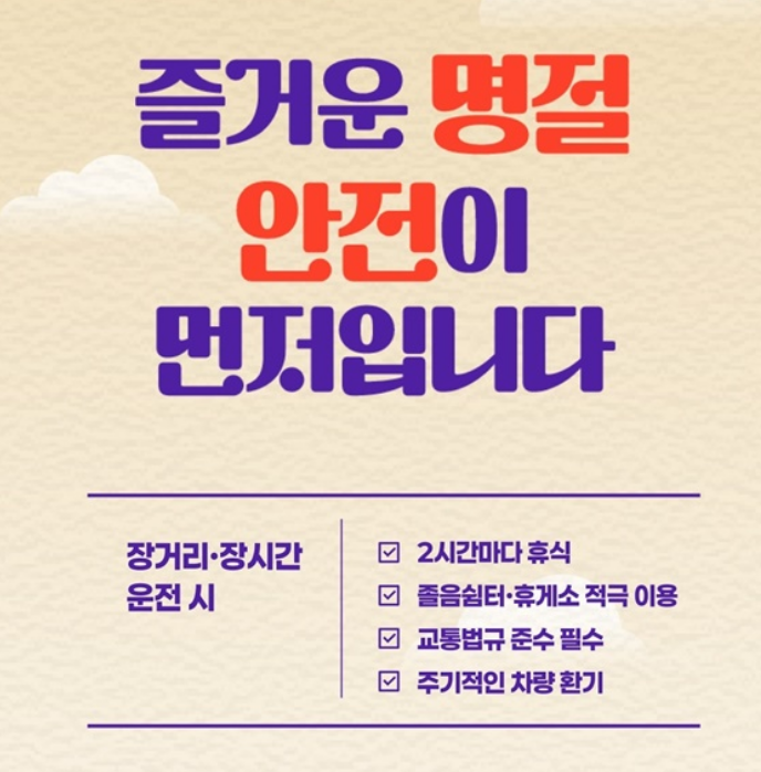 - 정체 예상 시간대(오전 9~12시, 오후 3~8시) 피하기