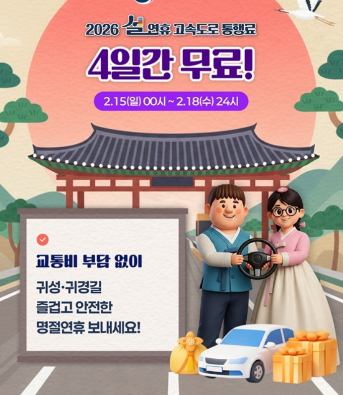 설날 고속도로 통행료 면제 기간은 2월 15일 0시부터 2월 18일 24시까지입니다. 해당 기간 중 이용하는 모든 차량은 자동으로 면제되니 교통비 부담 없고 실시간 교통정보 CCTV를 확인하면 더 빠르고 안전한 이동이 가능합니다 . 모두 즐거운 명절 보내시기 바랍니다.