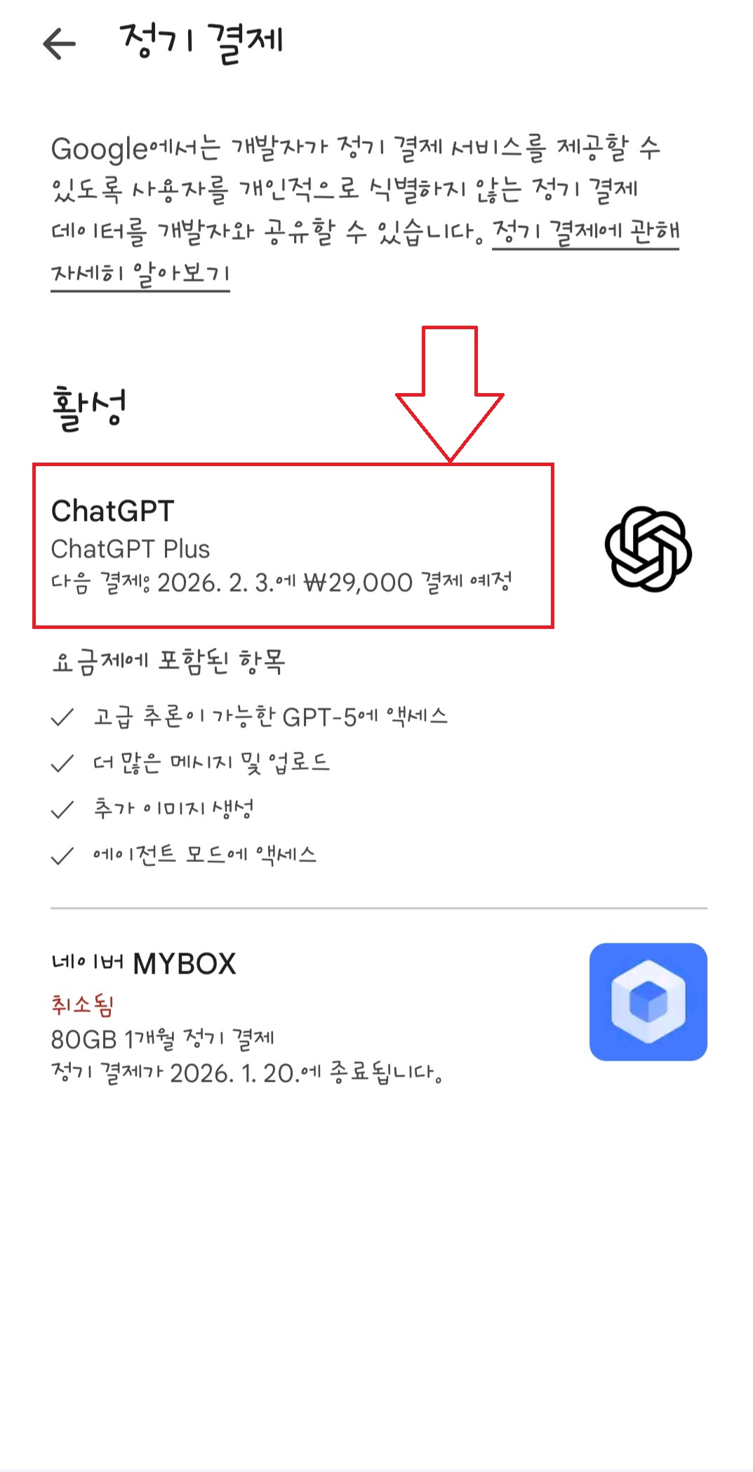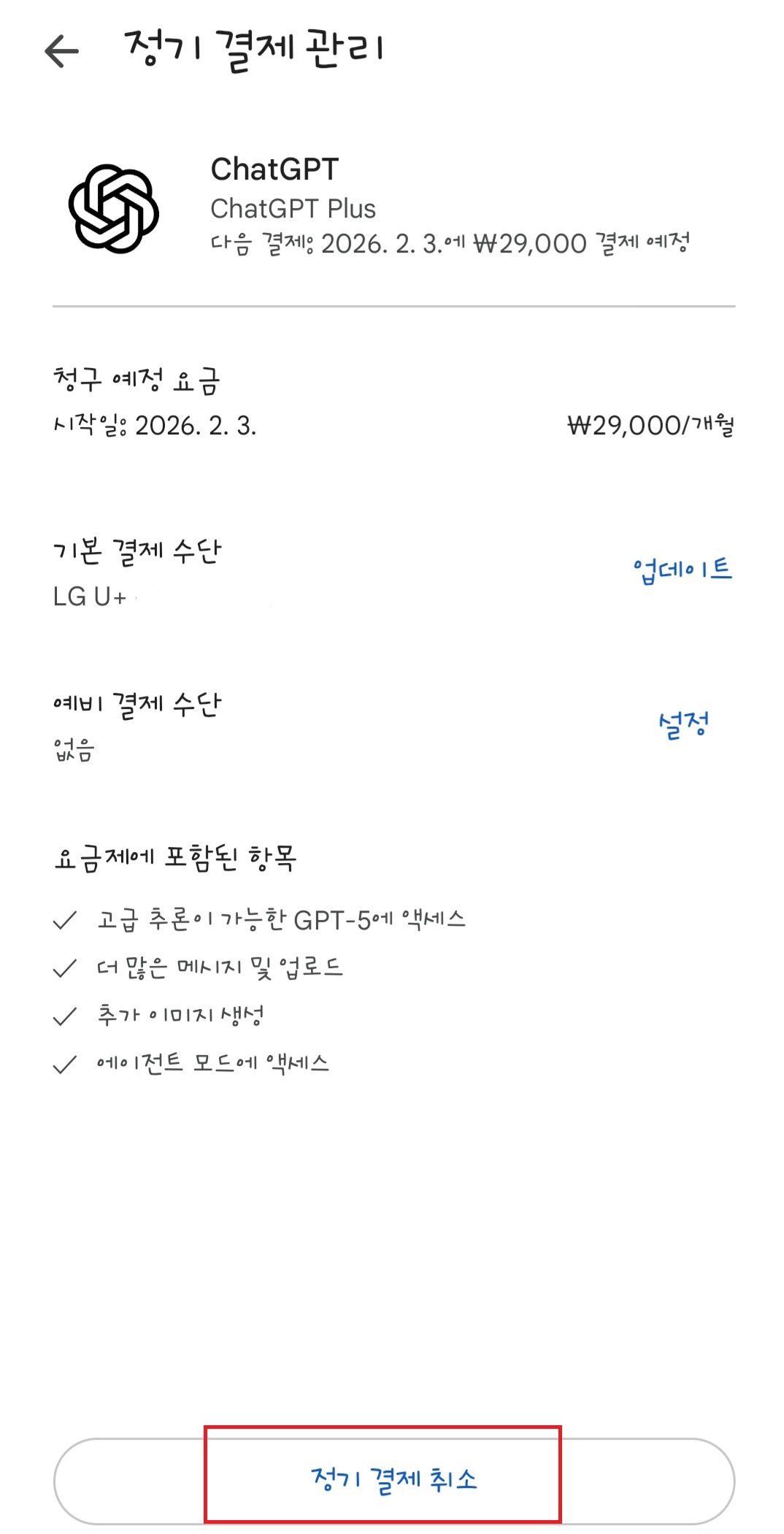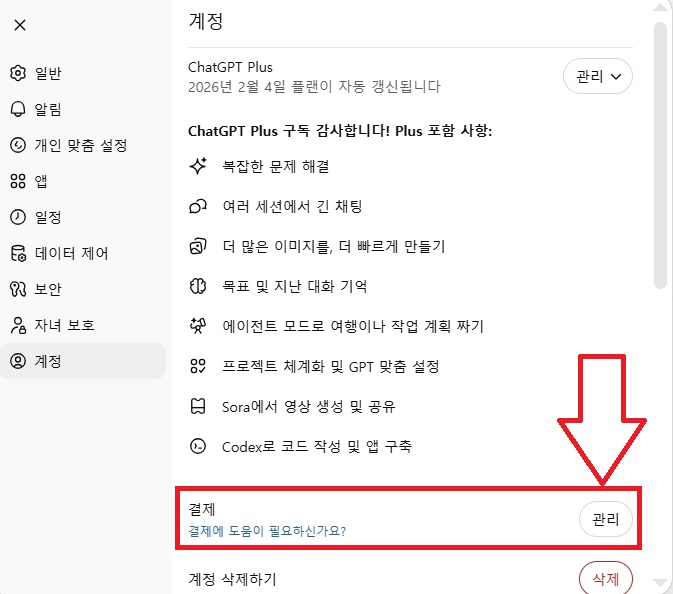 ④ 현재 활성화된 구독(예: ChatGPT Plus) 선택 하단에 보이는 ‘결제 취소’ 또는 ‘구독 해지’ 버튼 클릭