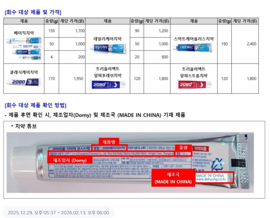 1) 먼저 결론: 2080치약 회수제품 리스트(공식 6종)
